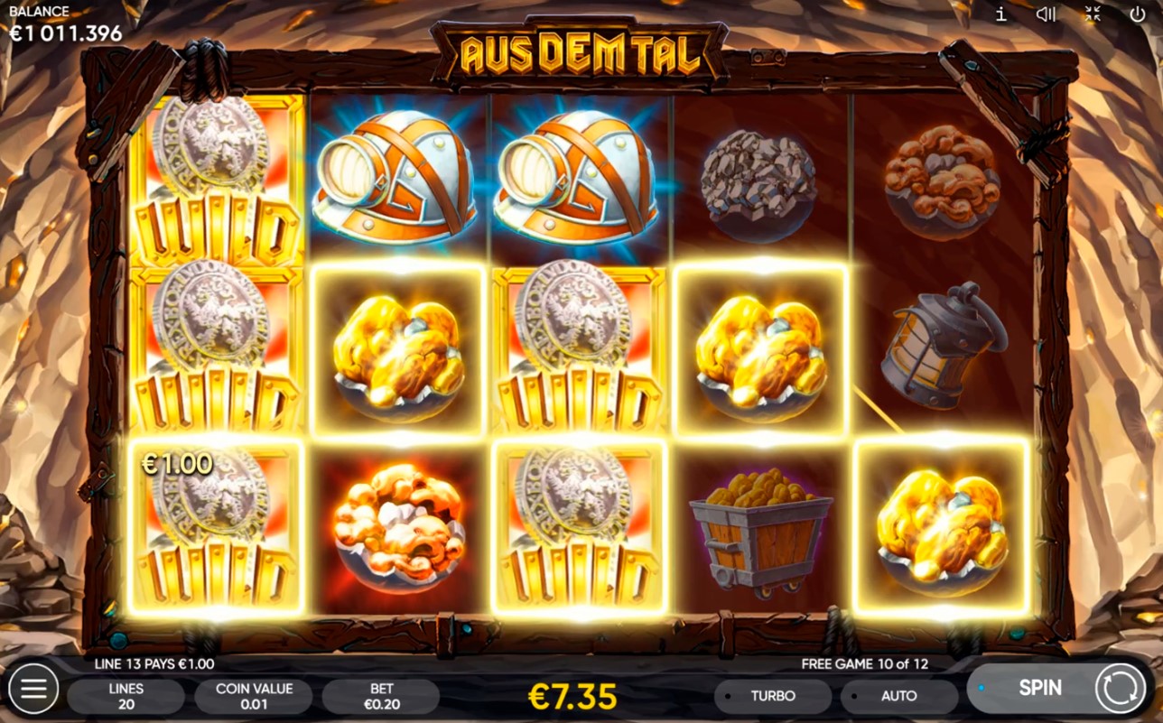 Aus Dem Tal — это игровой автомат, разработанный провайдером Endorphina. Этот автомат имеет девять приятных символов, которые представляют собой известные предметы и характеристики, связанные с жизнью в тех местах. Игра имеет 5 барабанов и 10 линий выигрыша, а также доступны до двадцати различных ставок. Это делает игру доступной для различных игроков, независимо от уровня их игровой активности.
