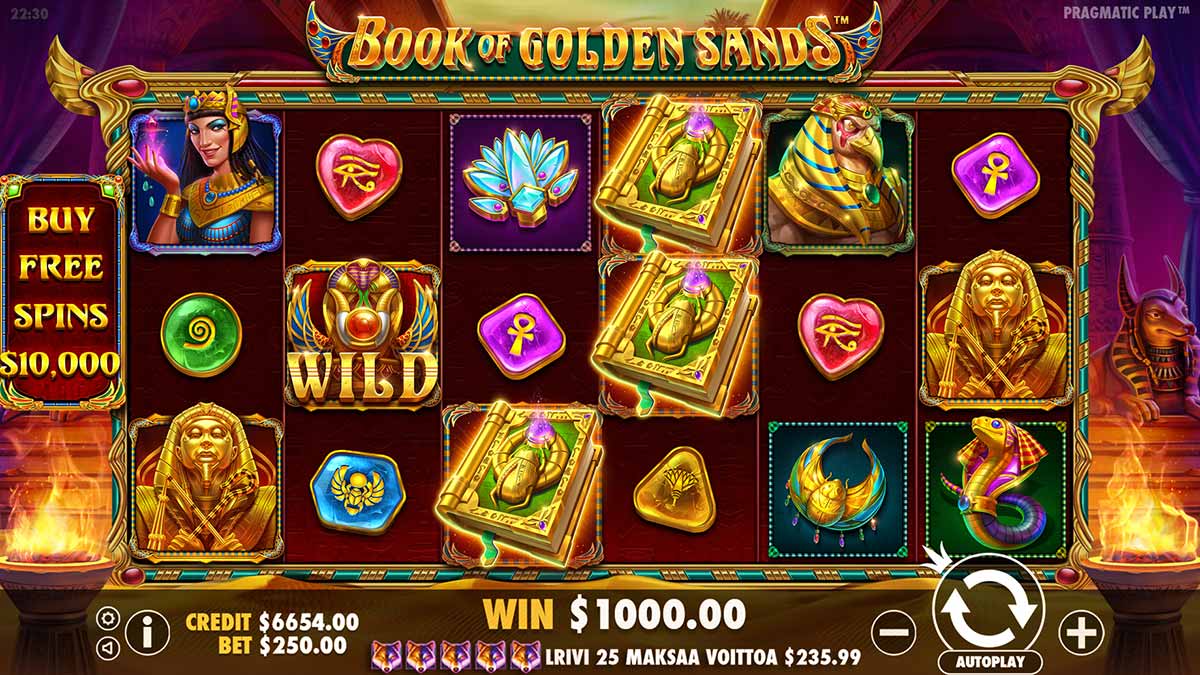 Book of Golden Sands от Pragmatic Play — это игровой автомат с 5 барабанами и 10 линиями выплат, который приносит вам возможность отправиться в путешествие к бесконечным золотым пескам Сахары. Вы должны отправиться в поиски древних предметов, которые помогут вам найти богатство и достичь благодати. В процессе игры вы увидите различные символы, включая привилегированные надписи, а также бонусную игру, которая поможет вам получить больше выигрышей.
