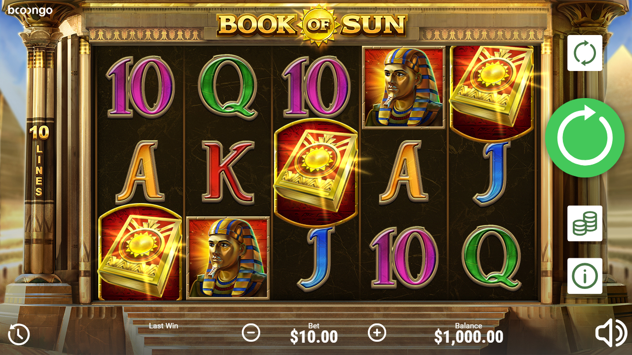 Book of Sun предлагает игрокам достаточно широкий диапазон ставок, начиная от 10 рублей и заканчивая максимальной ставкой в 1000 рублей. Данный игровой автомат имеет 5 барабанов и 10 линий.