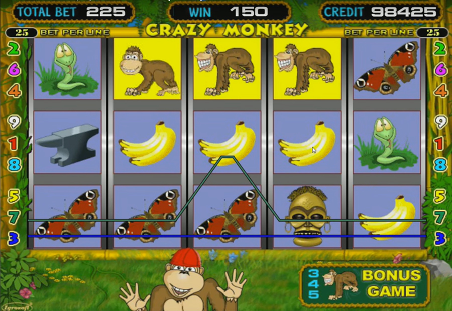 Игровой автомат Crazy Monkey предлагает игрокам максимально удобное и приятное игровое процесс. Все ставки можно делать от 5 до 25 рублей, а диапазон коэффициентов выигрыша варьируется от x2 до x2000. В игре присутствует бонусная игра, автоматическая игра и общий джек-пот на сумму от 10 000 до 250 000 рублей.
