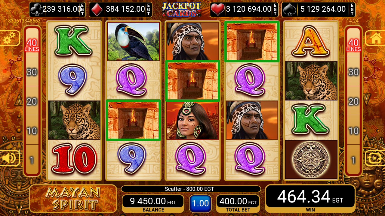 Mayan Spirit от провайдера EGT – это мастерски сделанный игровой автомат с пятью барабанами и до 40 активными линиями для ставок. Вы можете использовать различные размеры ставки, а также достичь джекпота в размере до 20000 рублей. При активации бонусной игры игроки могут заработать дополнительные призовые средства. Все это делает Mayan Spirit отличным игровым автоматом для размещения ставок и получения призов.
