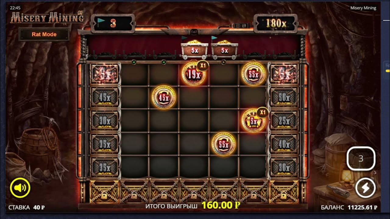 Misery Mining предлагает доступные ставки для игры для любого игрока. Минимальная ставка составляет 0.2 рублей, а максимальная — 100 рублей. Основная игра имеет максимальный джек-пот в 1000 раз от начальной ставки.