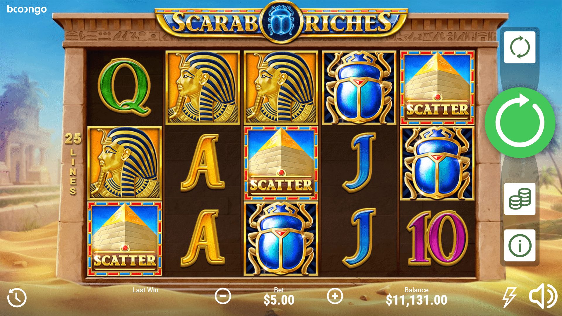 Scarab Riches – игровой слот от провайдера Boongo, посвященный древнему Египту. Игра имеет привлекательный дизайн и разнообразные бонусные функции. Игра довольно проста, и у игроков есть возможность получить высокие выплаты. Однако игра не имеет прогрессивного джекпота, мультиплеерного режима и мобильной версии.